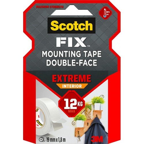 For your toughest jobs indoors go for strongest hold Scotch-FIX™ Extreme Interior Double-Sided Mounting Tape with its 3M™ Advanced Technology. Equipped with a powerful permanent adhesive this double-sided tape defies gravity. It is working on most surfaces indoor even for hard plastics like PP and PE. So whether you're mounting a coat rack in your new house or adding wall organisation to the basement Scotch-FIX™ Extreme Interior Double-Sided Mounting Tape does the job quickly easily and without tools. Application Instructions: Clean the surface with alcohol and let dry. Apply the tape. Push firmly for 60 seconds. WARNING: Do not hang in areas where injury might occur if mounted object were to fall. This product has a permanent adhesive and may cause damage if removed. Do not use on wallpaper or delicate surfaces. Ensure surface is flat smooth and able to hold mounted objects. Entire tape surface must adhere completely to both sides. Application temperature 10° C - 40° C.