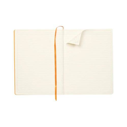 | Orange ribbon bookmark, orange expanding inner pocket and front and back pages. |