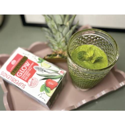 - Delicious herbal infusion with green tea aloe vera and added Biotin. The Superblends Glow has a sweet strawberry and fresh cucumber flavouring for a refreshing drink at any time of the day.