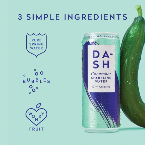 - British sparkling spring water infused with wonky cucumbers and mint for a crisp dash of flavour. Is there anything more refreshing than a cold can of sparkling Cucumber/Mint water? Like all of DASH??sparkling water drinks, it does not contain sweeteners, sugar or calories. Using just fresh ingredients such as spring water, bubbles and wonky fruit is part of the DASH mission to fight food waste.