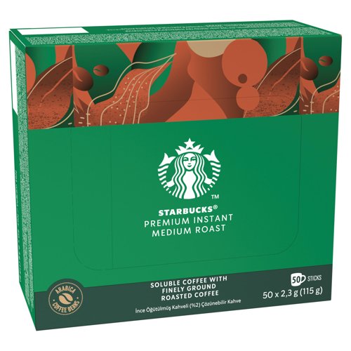 - Experience the rich, inviting aroma of STARBUCKS Premium Instant Medium Roast coffee. Crafted from 100% Arabica beans, this expertly blended coffee delivers a smooth, balanced taste with creamy notes of milk chocolate and nuts, inspired by the finest Latin American flavours.