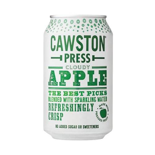 - Simply made using pressed Golden Delicious, Jonagold, Gala & Braeburn apples with sparkling water, Cawston Press' Sparkling Cloudy Apple Soft Drink is a thirst quencher sure to liven up your day. Providing an aroma and taste of freshly squeezed apples, it's more than a refreshing choice of drink. This 330ml sparkling cloudy apple drink does contain natural fruit sediment but has no concentrates, sweeteners or added sugars. The drink is vegan friendly, gluten free and supplied in a pack of 24 330ml cans that are fully recyclable.