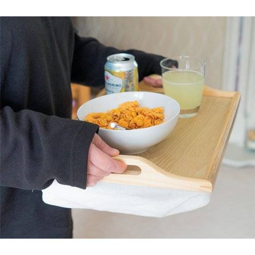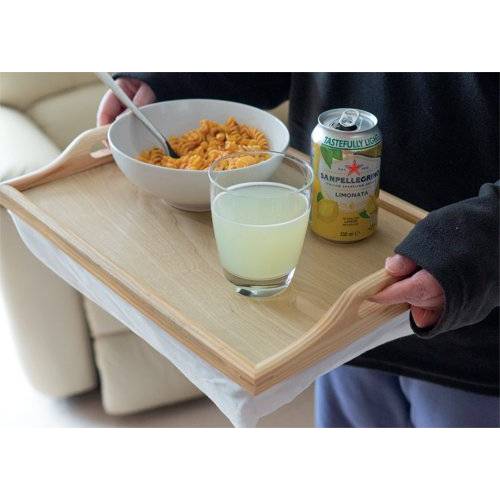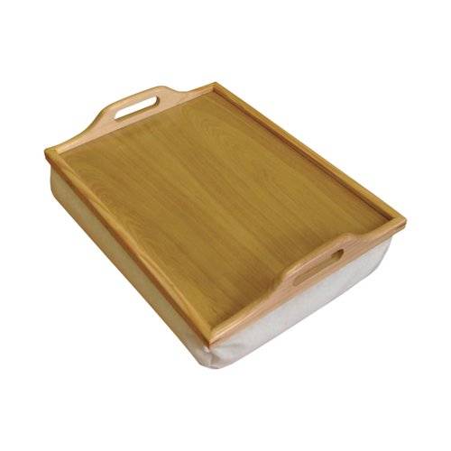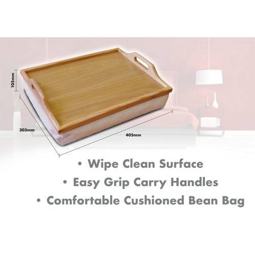 - This attractive and functional Lap Tray makes breakfast in bed, reading, writing and crafts easy and comfortable. The lap tray has a built-in cushion below the tray top, finished in plain beige, so will rest comfortably on your legs while you lie or sit. The tabletop surface has a pleasant design that will suit both modern and traditional homes and is laminated for easy cleaning. Featuring handles for ease of carrying and positioning the Lap Tray.