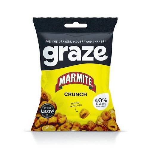 - Graze Marmite Crunch 35g pack with yeast extract seasoned broad beans and corn hoops. An intensely flavoured light and crunchy crisp alternative packed with vegetables. Supplied in a pack of 10.