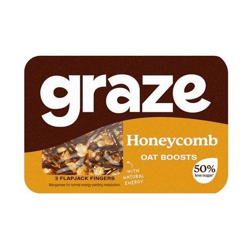 - Graze Honeycomb Boosts are wholegrain oat flapjacks made with golden syrup and honeycomb pieces topped with a chocolate flavour drizzle. Providing a source of manganese for energy-yielding metabolism these 50g bars are supplied in a pack of 9.