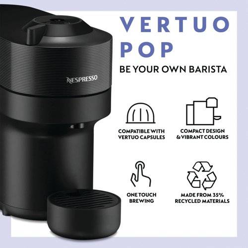 - Keeping low profile at 25cm, the Vertuo Pop is a sleek, compact coffee machine supplied in black. With automatic brewing parameters, the machine delivers signature crema, smooth taste and full flavour at the touch of a button. From espresso to mug, the choice from four cup sizes in a wide variety of blends including: Ristretto, Espresso 40ml, Double Espresso 80ml, Gran Lungo Cup 150ml, Mug 230ml and Large Mug 355ml. Made from 35% recycled plastics and rated energy efficient, it uses Vertuo coffee pods made from recyclable aluminium. This pack includes a complimentary welcome set of 12 Vertuo coffee pods.