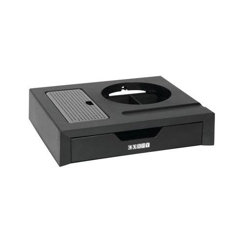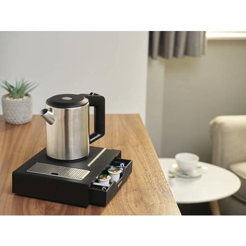 The Canterbury Drawer Tray is designed to elevate your hotel guest room's drinks experience. This sleek, space-saving tray accommodates all Corby Canterbury kettles and features a built-in drawer for sachets and a spoon holder. Its integrated drip tray ensures cleanliness, while anti-theft measures offer peace of mind. Easy to clean and designed with both functionality and style in mind, this welcome tray is the perfect addition to any guest room.