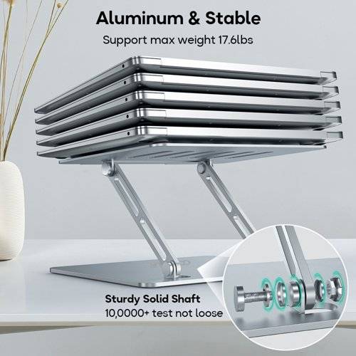 - Folding adjustable height aluminium laptop stand with vertical vented platform suitable for laptops up to 17 inch in silver