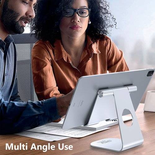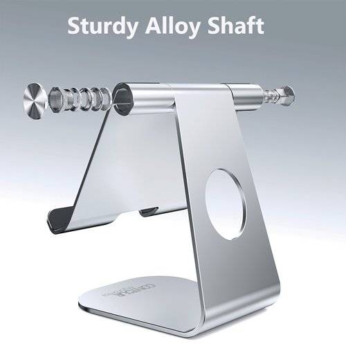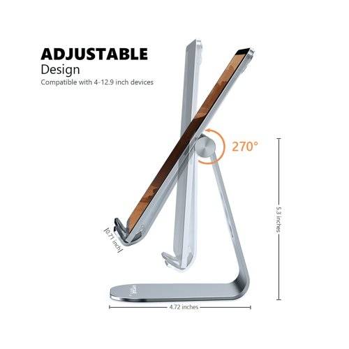 - Large hinged tilting aluminium tablet/mobile phone stand suitable for tablets/phones from 4 inch - 13 inch in silver
