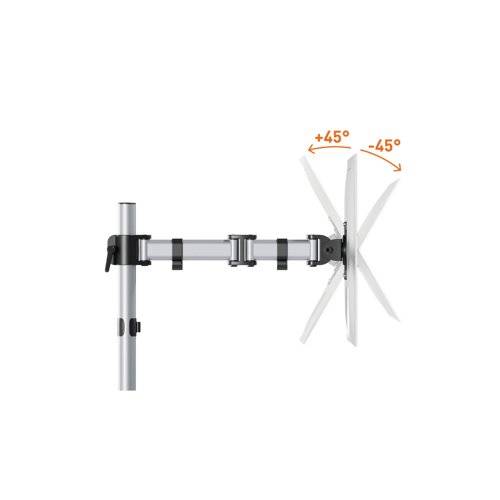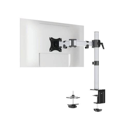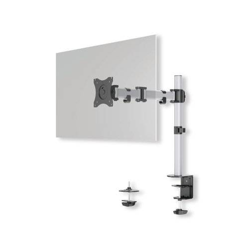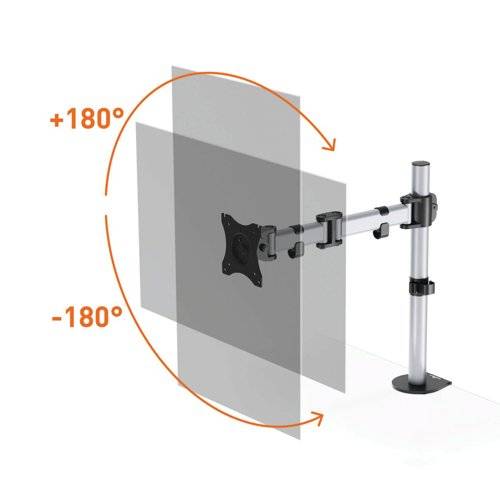 - Monitor mount for holding 1 screen which can be quickly installed to any desk using the desk clamp or bolt-through fixing. The height, angle and position of the monitor can be adjusted easily to facilitate ergonomic working. The mount allows the screens to be rotated 360 degrees for working in portrait or landscape mode. The arm can be flexibly extended to 40cm by three joints and swivelled up to 180 degrees. Simple height adjustment of the screen on a 44cm pole thanks to an integrated Allen key wrench. Universal VESA mount (75x75mm or 100x100mm). For standard monitors up to 27 inch and 8kg. The monitor cable is guided along the mount by cable channels and a clamp, which helps prevent the cables from being damaged. The monitor cable is guided along the monitor mount by 3 clamps which protect the cable. The mount also includes an integrated Allen key wrench which allows for the monitors to be raised up and down effortlessly.