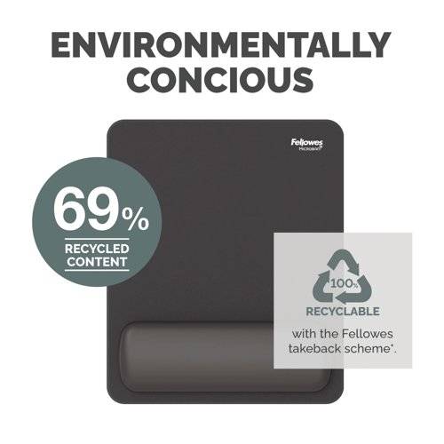 | MADE FROM 69% RECYCLED CONTENT - This Fellowes mouse mat is made from 69% post-consumer recycled content and is also 100% recyclable with Fellowes takeback scheme* |
