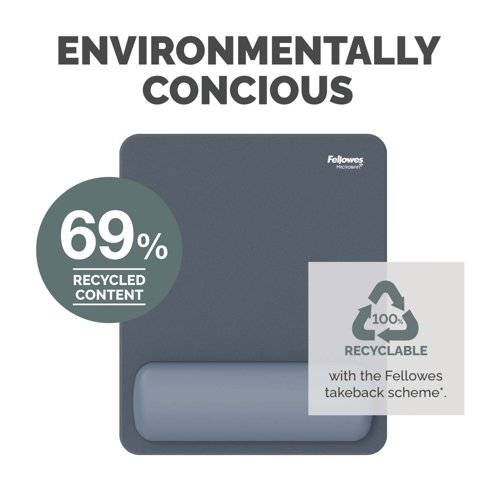 | MADE FROM 69% RECYCLED CONTENT - This Fellowes mouse mat is made from 69% post-consumer recycled content and is also 100% recyclable with Fellowes takeback scheme* |