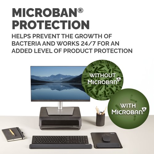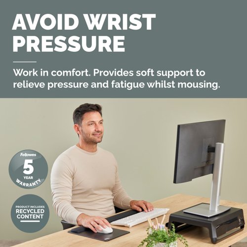 Experience all-day comfort and enhanced performance with the Fellowes Breyta™ XL Mouse Mat Wrist Support. Designed to be 23% larger than standard wrist rests, it encourages greater movement and helps reduce small repetitive motions that can lead to wrist strain. The wrist support conforms to your wrist for personalised comfort, helping to relieve pressure and fatigue during extended computer use. Featuring a soft-touch, anti-dust coated surface, it delivers a smooth and premium mousing experience. Made with Microban® antibacterial technology, the Breyta™ XL Mouse Mat Wrist Support provides continuous hygienic protection, making it ideal for shared or high-use workspaces. Compatible with both optical and laser mice, it enhances tracking performance while protecting your desktop. Made from 74% post-consumer recycled content and fully recyclable through the Fellowes takeback scheme*. This mouse mat combines ergonomic support and hygiene into one.