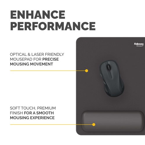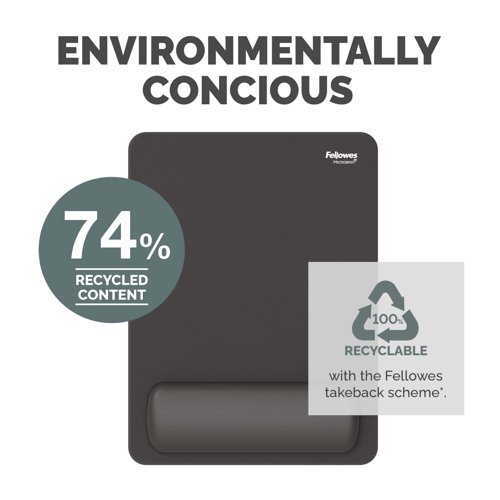 - Experience all-day comfort and enhanced performance with the Fellowes Breyta™ XL Mouse Mat Wrist Support. Designed to be 23% larger than standard wrist rests, it encourages greater movement and helps reduce small repetitive motions that can lead to wrist strain. The wrist support conforms to your wrist for personalised comfort, helping to relieve pressure and fatigue during extended computer use. Featuring a soft-touch, anti-dust coated surface, it delivers a smooth and premium mousing experience. Made with Microban® antibacterial technology, the Breyta™ XL Mouse Mat Wrist Support provides continuous hygienic protection, making it ideal for shared or high-use workspaces. Compatible with both optical and laser mice, it enhances tracking performance while protecting your desktop. Made from 74% post-consumer recycled content and fully recyclable through the Fellowes takeback scheme*. This mouse mat combines ergonomic support and hygiene into one.