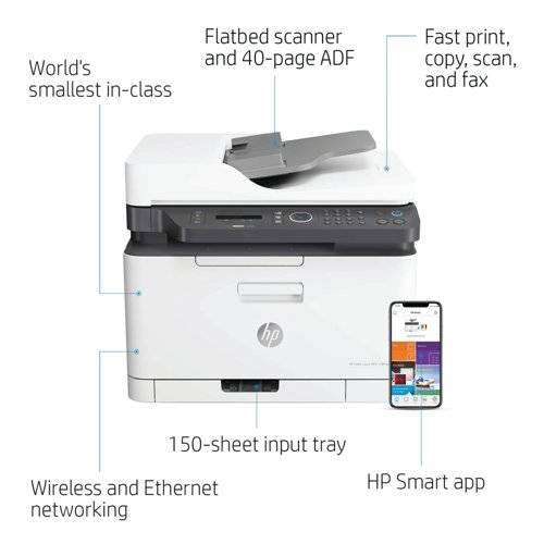 - Print, scan, copy and fax with ease with the HP Colour Laser 179FNW, producing high quality colour results and print and scan from mobile devices. This compact, dynamic, security enabled printer is suitable for printing a recommended monthly volume of up to 500 pages/month, offering print speeds of up to 18 pages per minute. This printer is intended to work only with cartridges that have a new or reused HP chip, and it uses dynamic security measures to block cartridges using a non-HP chip. Periodic firmware updates will maintain the effectiveness of these measures and block cartridges that previously worked. A reused HP chip enables the use of reused, remanufactured, and refilled cartridges.