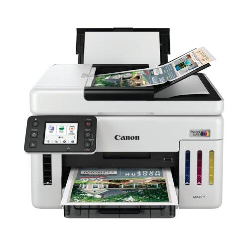 Efficiently handle busy schedules with a 50-sheet auto document feeder, a tiltable 6.9 cm colour touch screen, and a paper supply capacity of up to 350 sheets. Print on various media, including banners up to 1.2 meters in length. Reduce waste with energy-efficient inkjet printing using high-yield ink bottles, plus scan directly to network folders, email, or USB. A user-replaceable maintenance cartridge minimises downtime.