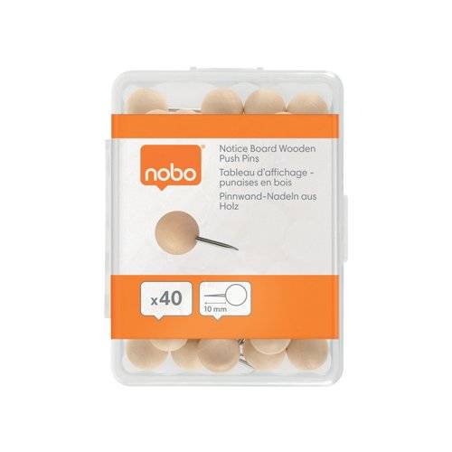 - Wooden push pins for use on cork and felt notice board surfaces are an essential addition to the workplace. These push in pins help with organisation by displaying notices, important notes and reminders quickly and securely. With a modern round wooden design, each pack contains 40 push pins, stored in a handy reusable storage box, perfect for offices, schools and home offices. For optimal performance, use with a Nobo notice board.