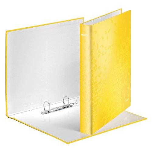 - Part of the vibrant WOW range, this Leitz ring binder is made from durable board, covered in bright, glossy paper. The binder features a standard 2 D-ring mechanism with a 25mm capacity for filing up to 230 sheets of A4 80gsm paper. The A4 plus size helps keeps contents protected, with each binder measuring W40 x D275 x H318mm. Ideal for colour coordinated filing, this pack contains 10 yellow ring binders.