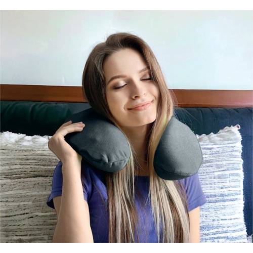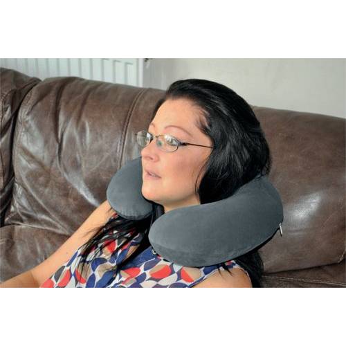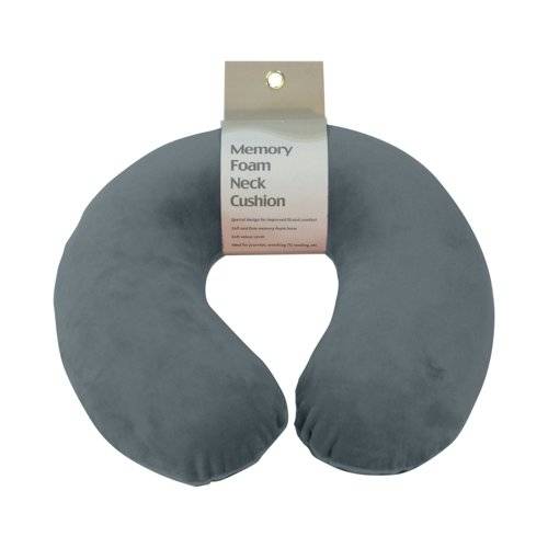 - This moulded neck cushion reduces pressure on the neck. It slips around the neck quickly and easily and provides a soft, but firm support for the head, reducing tension in the neck, head, shoulders for greater comfort and relaxation. Ideal for travelling, holidays, watching TV or reading, the Neck Cushion can be used in the home or out and about. Made from memory foam with a removable velour cover and has a fastening button to keep in place under the chin. Supplied in grey.