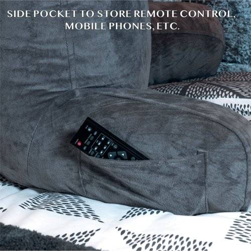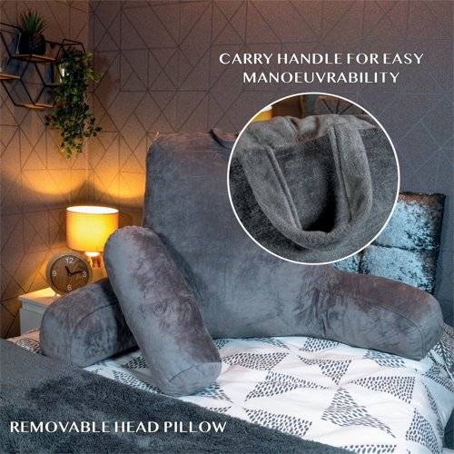 - This luxuriously comfy reading pillow has armrests that support your lower back and sides whilst you relax with a book/iPad or watching television. The pillow has a removable headrest that can be used as a leg raiser or bolster cushion. Two pockets are integrated to hold your phone or TV remote and a magazine or book. The pillow is filled with shredded memory foam that is both supportive and comfy. The pillow has a soft touch luxurious suedette finish which can be removed for machine washing.