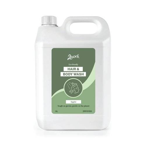 - This high foaming 2Work Eco Hair and Body Wash is suitable for use as shampoo, bubble bath, shower gel and as an all over body wash. The pH balanced formula is kind on skin and contains essential conditioning agents to cleanse, freshen and moisturise in one application. The hair and body wash leaves a lasting apple fragrance. Ideal for hotel rooms, gyms, changing rooms, health clubs, sports centres and shower areas, this pack contains 2 bulk 5 litre bottles.