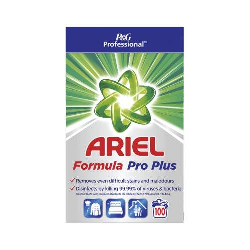 - Ariel Professional Plus biological washing powder is a professional detergent specially formulated to deliver exceptional cleaning results for professionals. Offering stain removal, malodour removal and certified disinfectant capabilities - killing 99.99% of viruses and bacteria. Supplied in a 6.5kg box providing up to 100 washes.