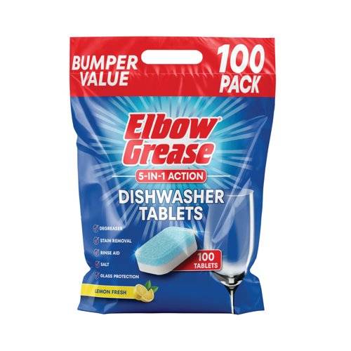 Elbow Grease Dishwasher Tablets are carefully formulated with the most powerful ingredients. Featuring a 5-in-1 formula that provides degreaser, stain removal, rinse aid, salt and glass protection. The tiny particles in each tablet work hard to penetrate tough stains; the salt will reduce limescale deposits; and the additional glass protection will prevent cloudy glasses. Supplied in a bumper pack of 100 tablets.