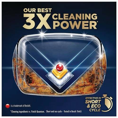 - Finish Ultimate Plus All-In-One dishwasher tablets deliver 3x more cleaning power than Finish Quantum, effortlessly tackling even the toughest, 48-hour dried-on stains, without the need to pre-rinse. The advanced formula cuts through stubborn grease and grime, ensuring sparkling clean dishes and a brilliant shine every time. Designed to perform exceptionally well in short and eco cycles, these powerful tablets save time and water whilst delivering superb cleaning results. The fast-dissolving technology activates quickly to work on even challenging loads, leaving dishes spotless with a citrus fragrance. Supplied in a pack of 29 tablets.