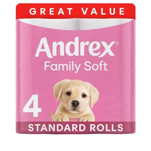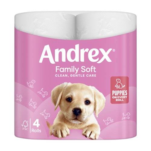 - For a pure and gentle clean. Embossed with puppies on every sheet. 2-Ply toilet roll, with 4080 sheets in total, that is approved by the British Skin Foundation. Previously 'Andrex Gentle Clean', Andrex Family Soft is still the same quality but with a different design. This packaging is made from 50 percent recycled plastic.