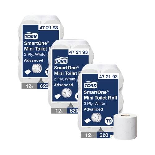 Designed for SmartOne Mini Twin dispensers, in spaces with low, medium or high traffic, this pack of twelve toilet rolls is the ideal choice for a hygienic washroom. Each roll in this pack has over 100 metres of high quality 2-ply toilet tissue featuring a SmartCore core for simple refilling. The single sheet dispensing system cuts use by up to 40% compared to traditional jumbo toilet roll dispensers, lowering consumption and costs. These rolls are environmentally friendly, made from 75% recycled paper which disintegrates quickly for reduced maintenance. This promotion includes 3 packs of 12 toilet rolls for the price of 2 (36 rolls in total).
