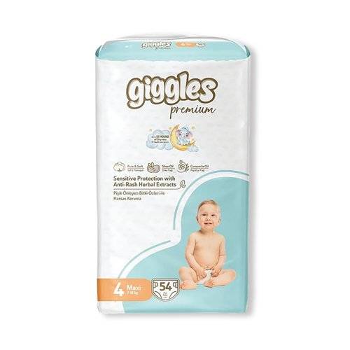 - Giggles Premium Jumbo Nappies - Maxi provide dependable protection for older babies. The combination of ultra-soft materials, breathable construction and high absorbency supports comfort during longer wear periods. Dermatologically tested and suitable for sensitive skin. Leak-proof barriers and flexible side tapes support active movement, while the wetness indicator simplifies change routines. Supplied in a pack of 54.