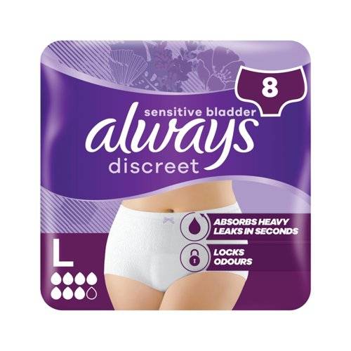 - Always high-waisted incontinence underwear is designed specifically for women experiencing moderate to heavy bladder weakness. These disposable pants are engineered to look and feel like regular underwear while providing advanced protection through a thin triple-layer core. Made from soft cotton-like fabric with a feminine print, the pants hug to the curves for a smooth look under clothes. Supplied in a pack of 8.