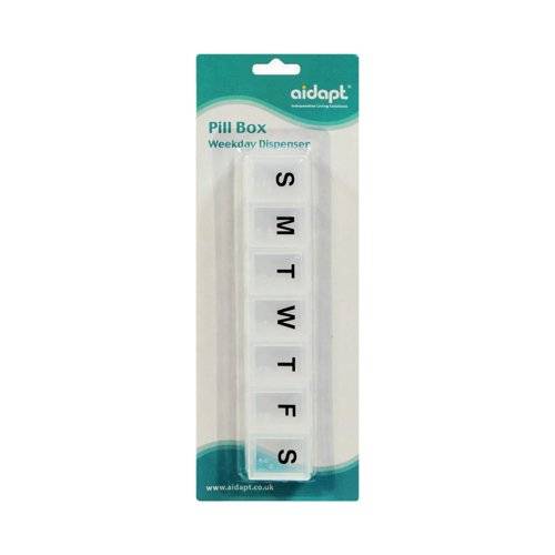 - The affordable Weekly Pill Dispenser provides a simple reminder to take your medication, with one clearly labelled compartment per day, also featuring braille for identification for each day's compartment. The Small Weekly Pill Dispenser is compact and ideal for travel, with easy-to-use flip top lids for each day it is also suitable for use at home or work.