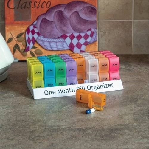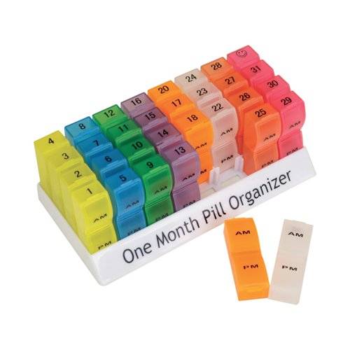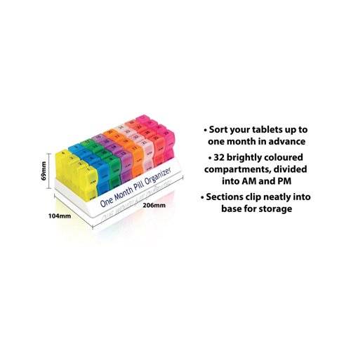 - This pill organiser is ideal for sorting tablets up to one month in advance. The 32 individual compartments are all brightly coloured and marked clearly with the date. Each section has a separate flip up lid for AM and PM tablets. The compartments clip neatly into the base for easy and tidy storage.