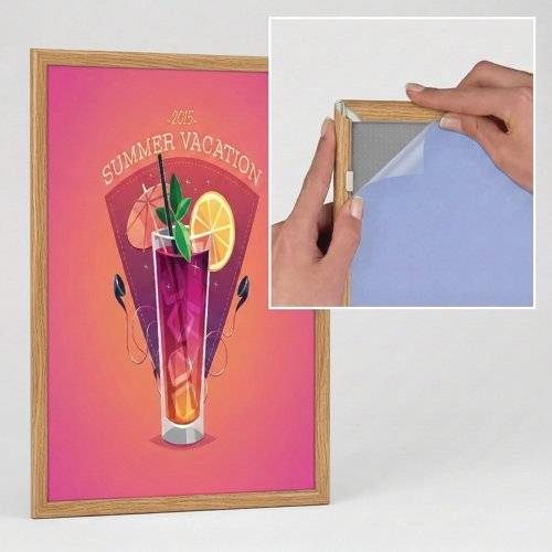 - A very neat narrow 15mm profile snap frame for smaller sizes. It is so easy to clip open the aluminium frame to access your poster or graphic image which is protected by an anti-glare plastic cover sheet. Available in oak wood effect finish.