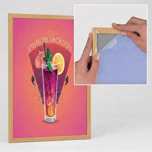 - A very neat narrow 15mm profile snap frame for smaller sizes. It is so easy to clip open the aluminium frame to access your poster or graphic image which is protected by an anti-glare plastic cover sheet. Available in pine wood effect finish.