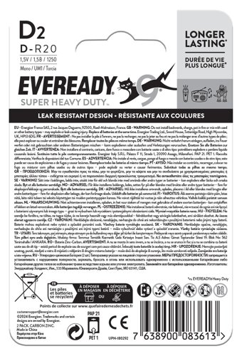 - Eveready batteries allow you to power all of your devices with ease, ensuring that they can last for longer without any poor performance. Made from carbon zinc, these batteries are cadmium and mercury free, ensuring that they are non-toxic and ecologically friendly. This pack of 2 Size D batteries allows you to power a range of different devices, including torches, toys, radios and clocks. These reliable batteries are good for up to 3 years after the printed date.