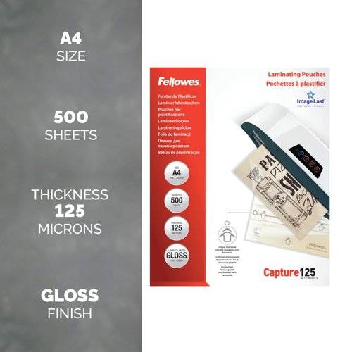 - Each pouch provides sturdy protection for A4 posters, notices, documents and more from scrapes, creases and spills. The ideal choice for frequently handled documents, keeping them clean and pristine for a professional look and to make sure important notices are always visible and clear. These laminating pouches have been designed to provide a glossy finish and robust durability against fingerprints, smudges and ripping while enhancing the colours and contrast of the print. The unique ImageLast directional quality mark disappears after lamination and ensures laminating pouches are inserted correctly into the laminator. This pack includes 500 pouches.