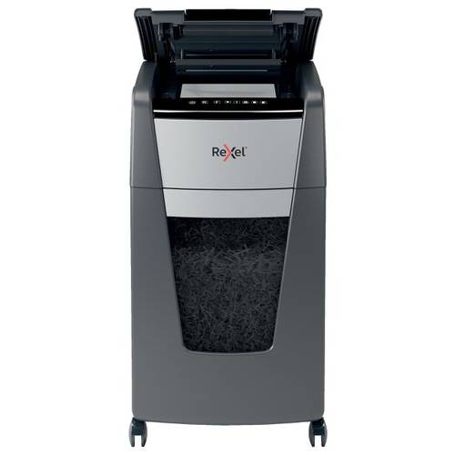 Rexel Optimum AutoFeed+ 225X cross-cut shredder automatically shreds up to 225x A4 sheets of paper (80gsm) at a time, into P-4 (4x25mm) cross-cut pieces. This auto feed shredder machine is a sophisticated office shredder, featuring a 60L pull out bin. The auto-feed removes the need to manually feed paper, and with the capability to accept staples and paper clips, the tedious process of manual removal is also unnecessary.
