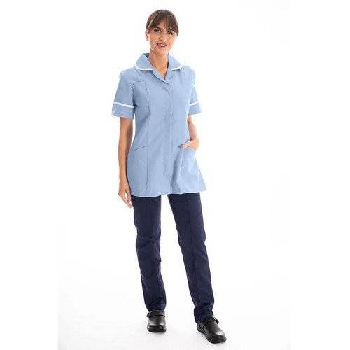- The DVDTR Female Nursing tunic is a timeless classic worn by millions of our nurses and carers across the UK. With PU lined pockets to protect from pen breakages, and a trim on collar and sleeves which is great to distinguish between job roles and departments.