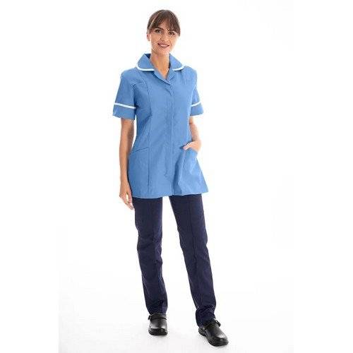 - The DVDTR Female Nursing tunic is a timeless classic worn by millions of our nurses and carers across the UK. With PU lined pockets to protect from pen breakages, and a trim on collar and sleeves which is great to distinguish between job roles and departments.