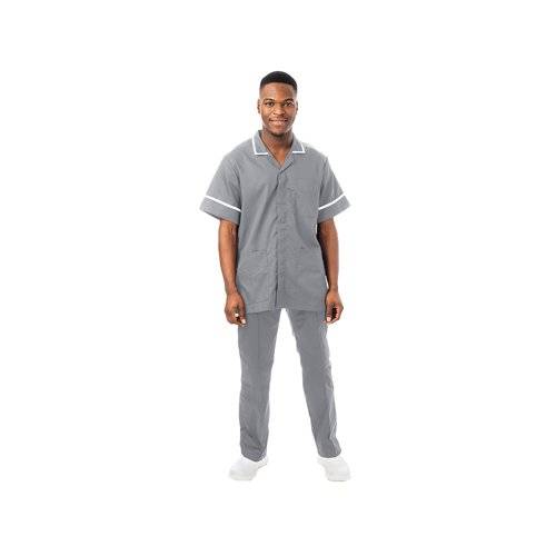 - Professional men's healthcare tunic designed for comfort and durability in medical settings. Crafted from a robust 65% polyester/35% cotton blend this white tunic features a classic revere collar with stylish trim. Practical design includes convenient poc
