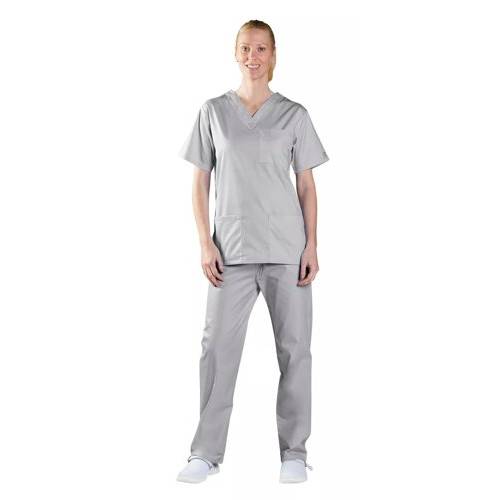 - Professional medical scrub top designed for healthcare and industrial professionals. This versatile unisex top offers exceptional durability with 65% polyester and 35% cotton fabric, capable of withstanding industrial laundry up to 85 Degree C. Featuring practical chest and lower pockets with a pen slot, comfortable V-neck design, and side vents for enhanced mobility.