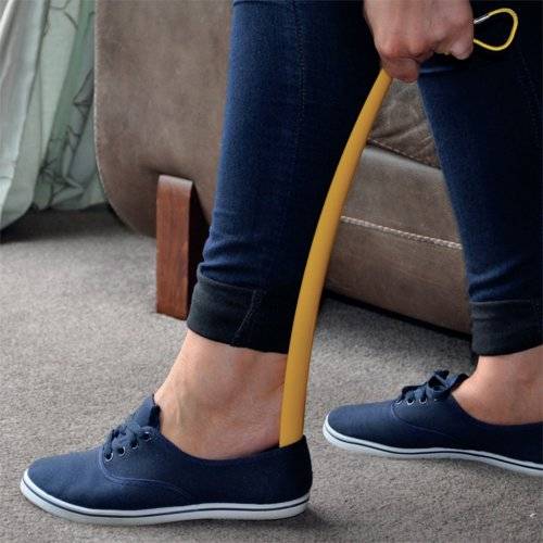 - A conventionally shaped Plastic Shoehorn with extended length for easier use. This sturdy shoehorn is a handy dressing aid featuring a hook for positioning shoes and a hanging loop for storage. Supplied in yellow.