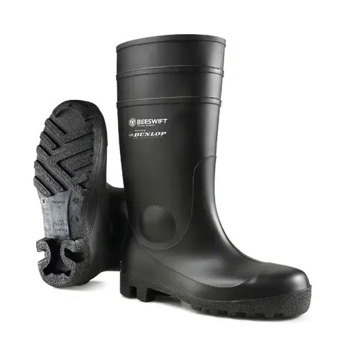 The Dunlop Aston safety wellington boot with a steel toe cap and steel midsole for protection. For additional safety features the boot has an anti-static and energy absorbing sole. Oil resistant and waterproof. Meets Standard to EN ISO 20345 S5 SRA.