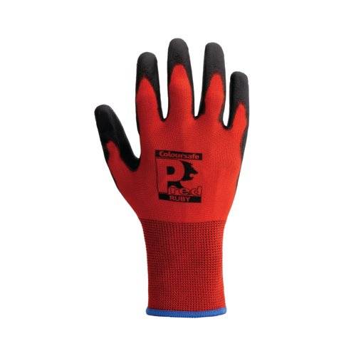 - Pred Ruby Cut A Safety Gloves have a red Polyester breathable liner and Polyurethane (PU) palm coating as well as a coloured cuff size indicator. Supplied as 1 pair.