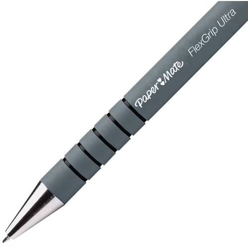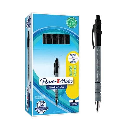 - This pack of 12 PaperMate FlexGrip Pens with black ink provide a stylish and comfortable choice for business, school and home. With Lubriglide ink and a medium 1mm tip, they ensure smooth and bold lines whether drawing or writing. FlexGrip pens feature a rubberised barrel along the entire length for exceptional all-round grip and comfort throughout the day. The retractable mechanism protects the pen from damage when not in use and can be extended with the click of a button.
