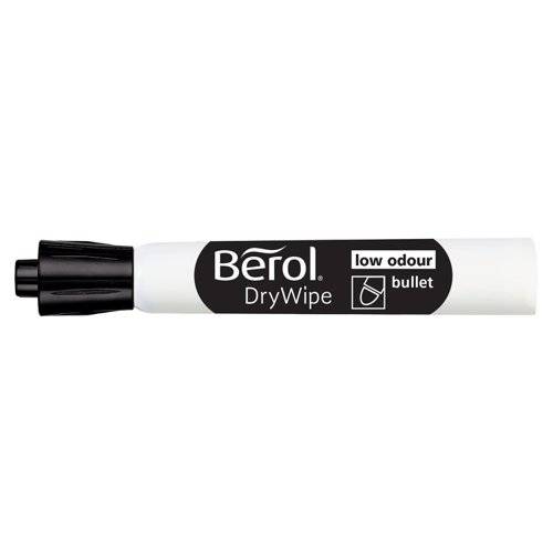 - Berol Dry Wipe whiteboard markers feature low-odour ink, making them perfect for sharing thoughts and ideas in offices, classrooms and the home. This classroom pack of Black whiteboard pens have a bullet tip that draws a bold, rounded line, writes smoothly at any angle and is easy to read from a distance, plus the large barrel provides a comfortable grip, whatever the task. When not in use, the clever cap and barrel design allows for horizontal stacking.