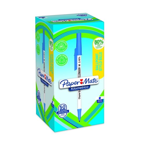 - The Paper Mate Kilometrico Recycled pens are made from 80% recycled material and provide bright, vivid lines. It features a colour-coded cap, a rounded barrel for comfort, 1000m+ writing length and comes in plastic-free packaging.