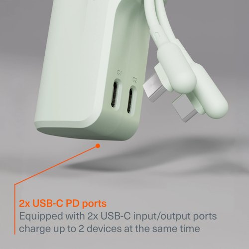 - Good Design Award Winner Accolade 2025 in the Product Design category for exceptional design and innovation. Equipped with 2x USB-C input/output ports, you can charge your device and your friends at the same time. Compact & lightweight, this 20W fast charging Power Bank easily fits into your pocket or bag, so you're always ready to go. The built-in LED display clearly shows the charge status, so you'll always know when it's time to recharge. Keep your device powered while you recharge the Power Bank at the same time with the included USB-C cable. Includes a detachable USB-C right-angle cable that can be neatly tucked into the built-in cable organiser, offering everything you need in one unit.